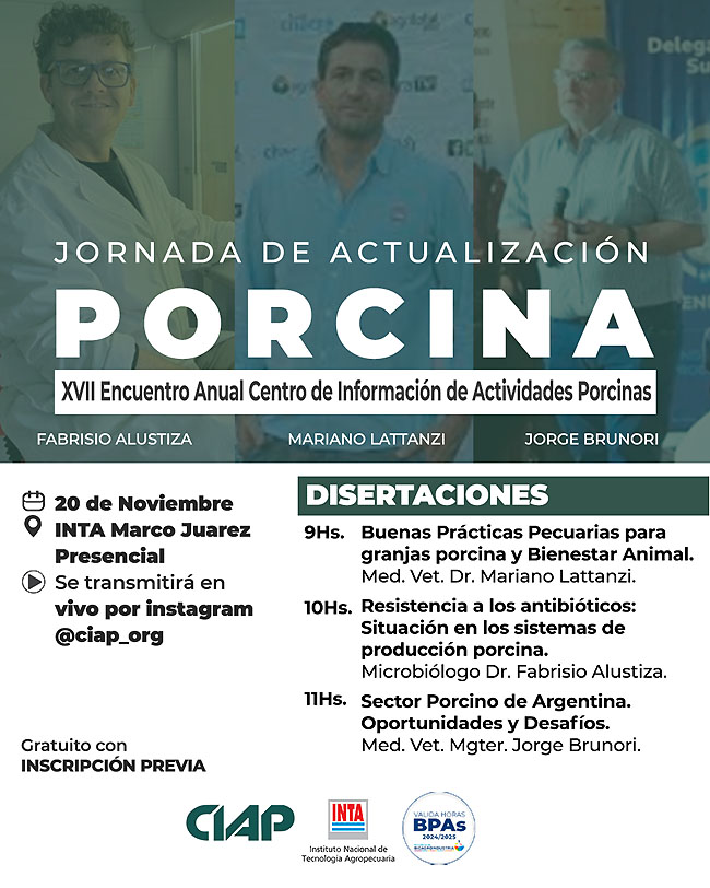 – 10:00 hs. Resistencia a los antibióticos: situación en los sistemas de producción porcina, por el Microbiólogo Dr. Fabricio Alustiza.