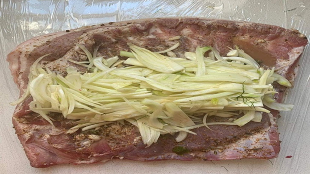 Antes de enrollar la carne se le practican cortes, en forma de rombos para que la misma se impregne bien de los sabores del adobo. El cocinero propone usar sal gruesa, pimienta, coriandro y semillas de hinojo pero no así nomás. “Quedan mucho mejor si las tres especias están tostadas”, dice. También usa ralladura de limón y de jengibre, algo de chile seco (que pique un poquito), vinagre de vino tinto y ajo picado. “Elegí esta marinada porque es bien fresca y contrarresta un corte tan graso. Sino, se puede usar la clásica que es tomillo, romero y ajo.