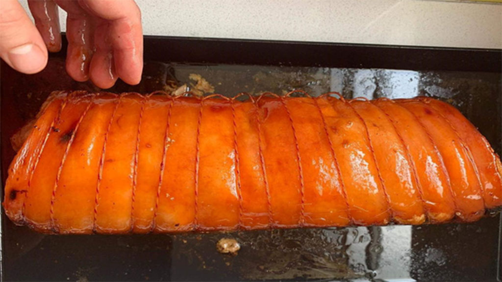 Durante la cocción, la porchetta largará mucha grasa por lo que es ideal colocar sobre la asadera una rejilla y colocar sobre ésta la pieza de carne con la unión hacia abajo. “Pintar el cuero con la grasa cada tanto ayuda a obtener el color deseado”, explica el cocinero y destaca que “lo que no se negocia en la porchetta es el cuero crocante por fuera”.